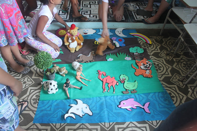 Terminada a oração, motivei: "Hoje vamos falar sobre a criação do mundo. Quando Deus criou o mundo, a terra estava vazia. Deus foi criando e colocando cada coisa no seu devido lugar. E Ele viu que tudo era muito bom...