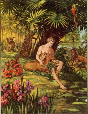 Criou um jardim, o Paraíso, com a árvore da ciência no centro: imagem da natureza da ciência é o conhecimento do bem e do mal. A serpente é o símbolo clássico da traição por ser adorada como um deus por povos vizinhos aos judeus.