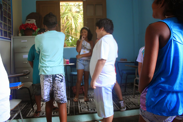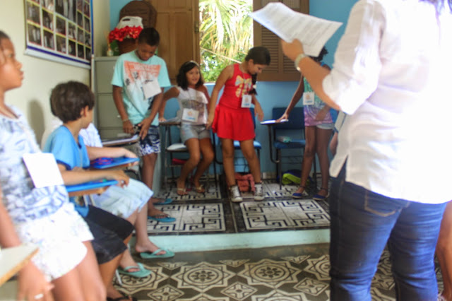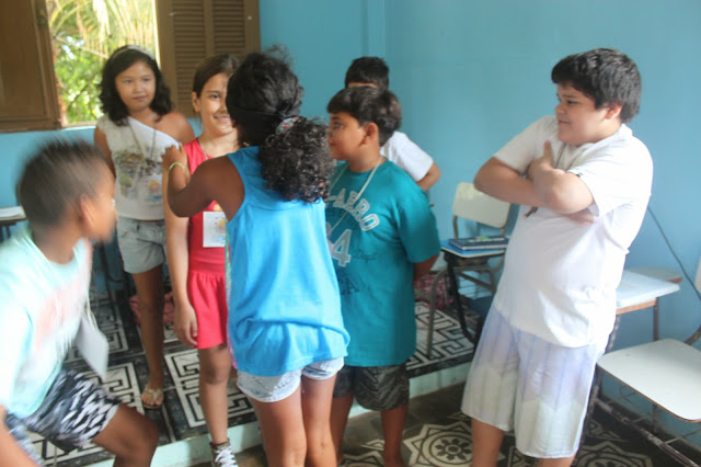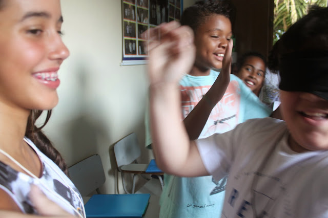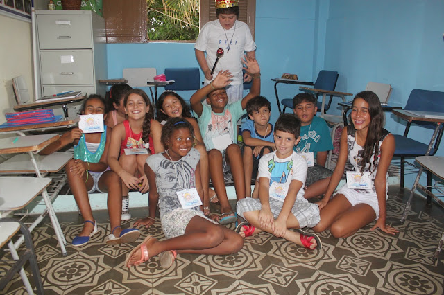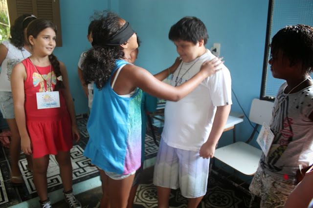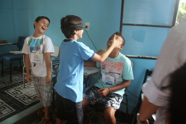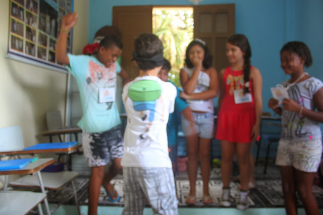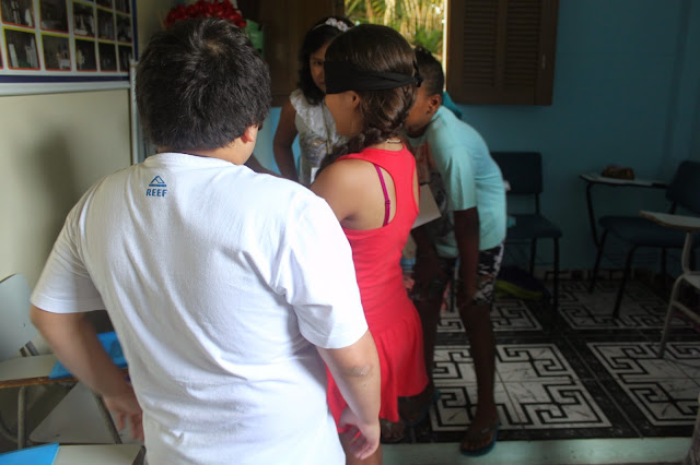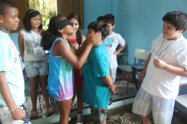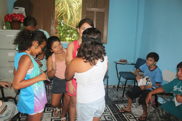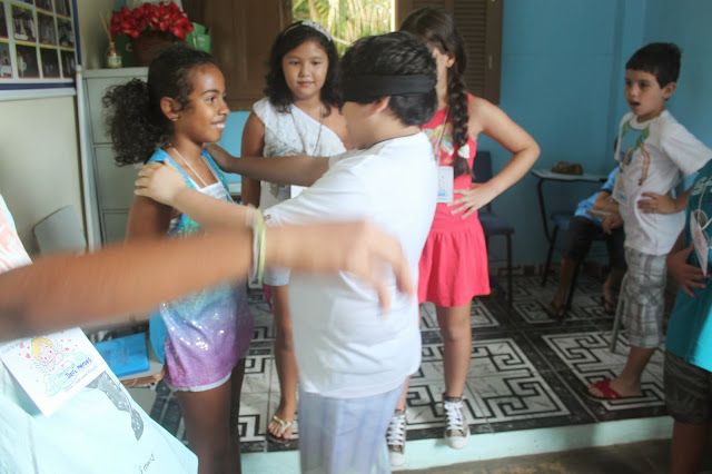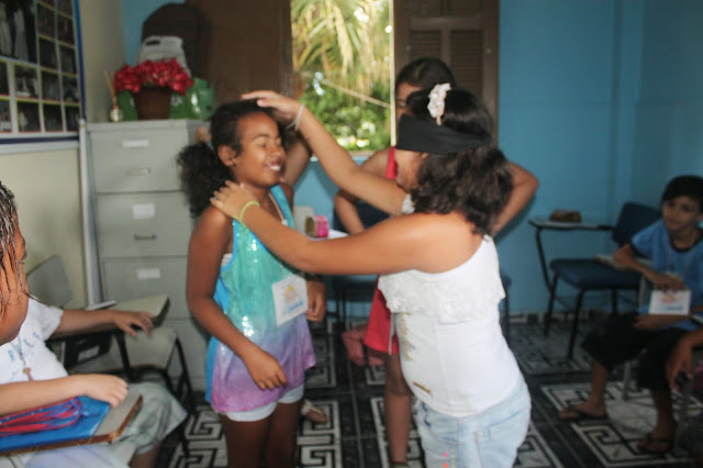 Após a oração, pedi que formassem um círculo e um catequizando de cada vez se posicionou no centro do círculo e, com os olhos vendados, escolheu sua côrte, tocando com a mão o seu coleguinha, procurando acertar o nome. Aquele que acertou mais nomes, foi coroado rei.