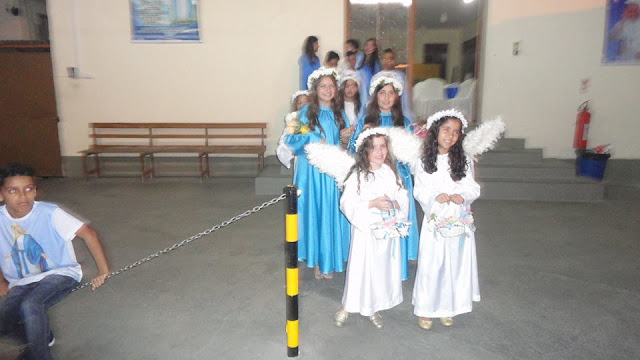 Na frente, duas meninas pequenas vestidas de anjo; atrás dos anjos, as duas meninas que vão coroar e atrás delas, meninos e meninas com mantos nos ombros, entram em duplas (fotos 1 a 4).