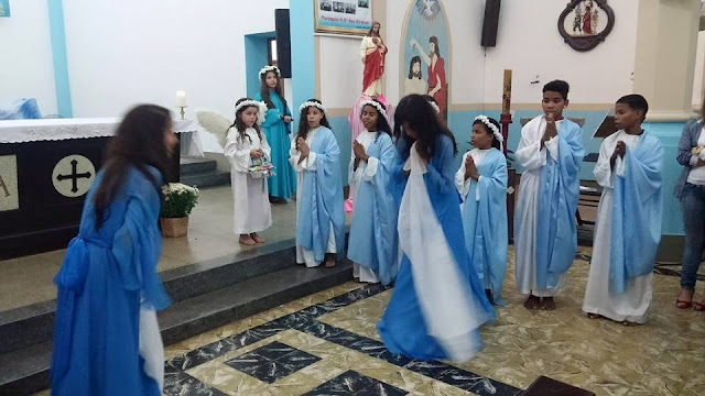 As crianças coroam a imagem de Nossa Senhora fazendo uma coreografia com as mãozinhas (fotos 16 a 23).