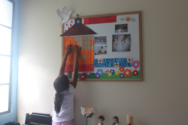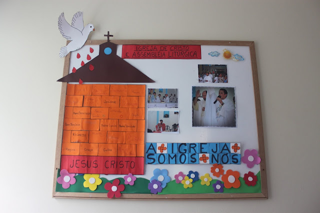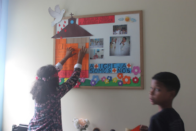 - Desenhar tijolos em cartolina e recortar: um para cada criança. Cada tijolo deve ter o nome de uma criança e devem ser preparados de modo a formar uma igreja, quando forem ajuntados. Podemos levar outros "tijolinhos" com o nome do pároco, do bispo - também o nome de alguns apóstolos, para montar a igreja. Faça um tijolo maior para formar a base e escreva nele o nome de Jesus Cristo, o alicerce da Igreja.