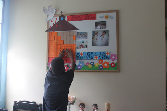 - A seguir, colocará o seu "tijolinho" na Igreja que está desenhada na cartolina, de tal modo que a parede da Igreja seja formada com o nome de todos.