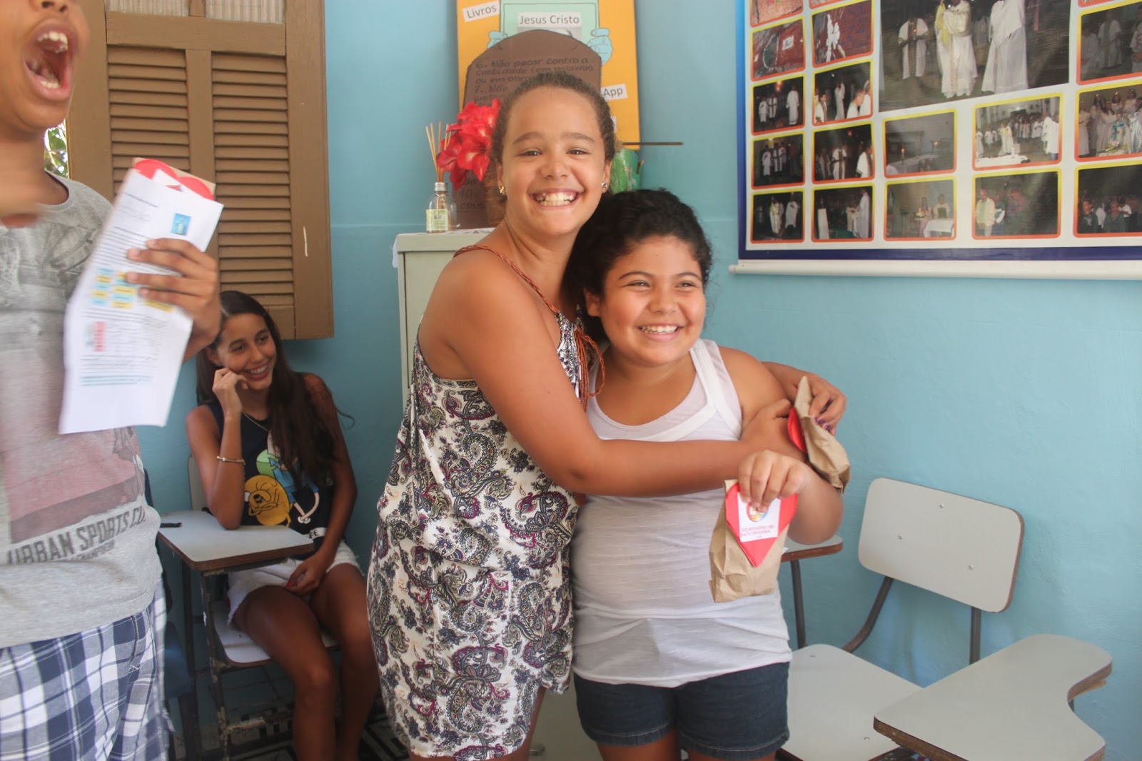 Terminada a oração, cada um entregou o saquinho de doce para aquele que constava o nome no coração e deu um abraço no colega.